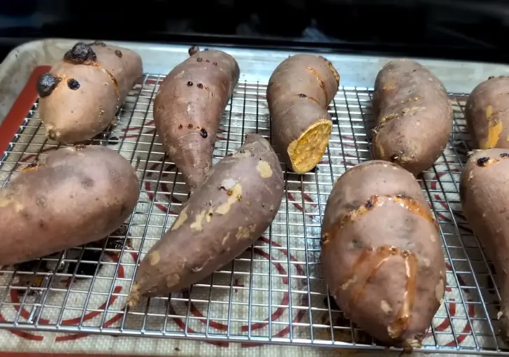 - Preheat the oven to 425°F. Rinse the sweet potatoes and poke each one several times with a fork. Place them on a roasting tray and roast for 45 minutes to 1 hour and 15 minutes. They are done when they are completely fork-tender. Remove them from the oven and let them cool until they are safe to handle.