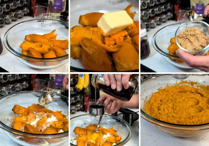 - Once the sweet potatoes are cool enough to touch, peel off and discard the skins. Place the peeled sweet potato flesh into a large mixing bowl. Add the 4 tablespoons of butter, 1/3 cup brown sugar, 1/2 cup whole milk, 1/4 cup maple syrup, the egg, 1 teaspoon vanilla extract, and the cinnamon. Use a hand mixer to combine everything. Mix just until all ingredients are incorporated and the mixture is creamy. Do not overmix.