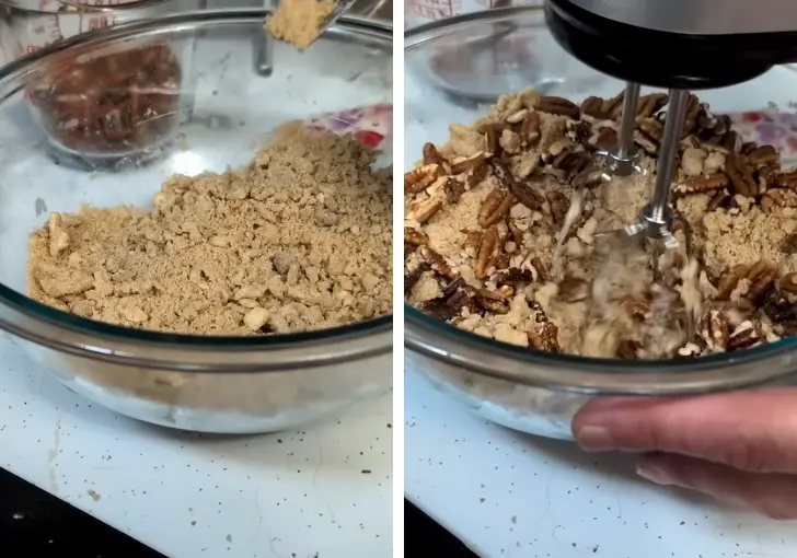 - In a separate mixing bowl, combine the 3/4 cup brown sugar and 1/2 cup flour. Add the 6 tablespoons of softened butter. Mix these together briefly, just until the butter starts to incorporate. Add the chopped pecans and stir them in until the mixture is crumbly and the pecans are evenly distributed.