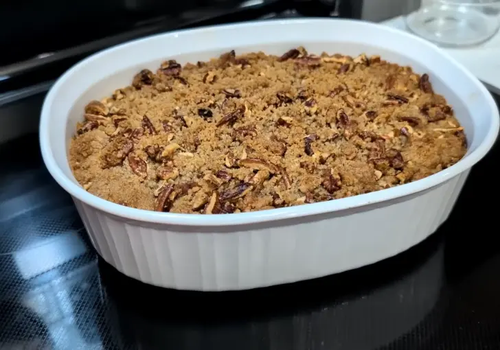 Sprinkle the pecan streusel topping evenly over the sweet potato base. Do not press it down; let it sit loosely on top. Place the dish, uncovered, in the preheated 350°F oven on the middle rack. Bake for 30 to 40 minutes.