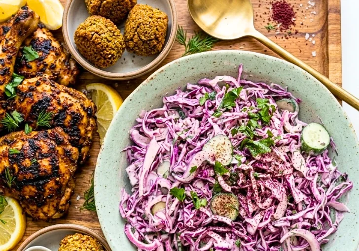 Grilled Chicken – Grilled chicken works great with this slaw. The smoky meat and tangy sumac dressing balance each other nicely. You can layer both into a bowl or tuck them inside warm pita bread.