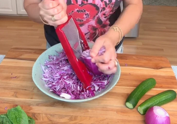- Thinly slice the red cabbage using a mandoline or a sharp knife. The slices should be very fine so the cabbage softens slightly when mixed with the dressing while still staying crunchy. Place the sliced cabbage in a large mixing bowl.