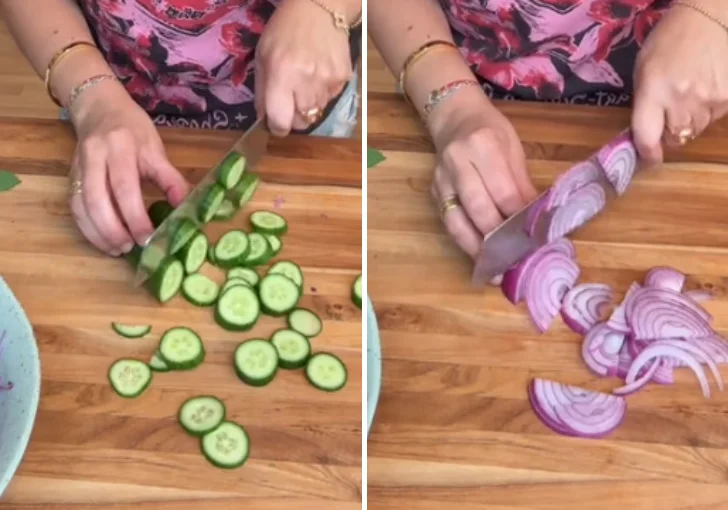 - Slice the cucumbers into thin rounds and add them to the bowl with the cabbage. Cut the red onion into very thin slices so it blends well with the slaw without overpowering the other flavors. Add the onion to the bowl.