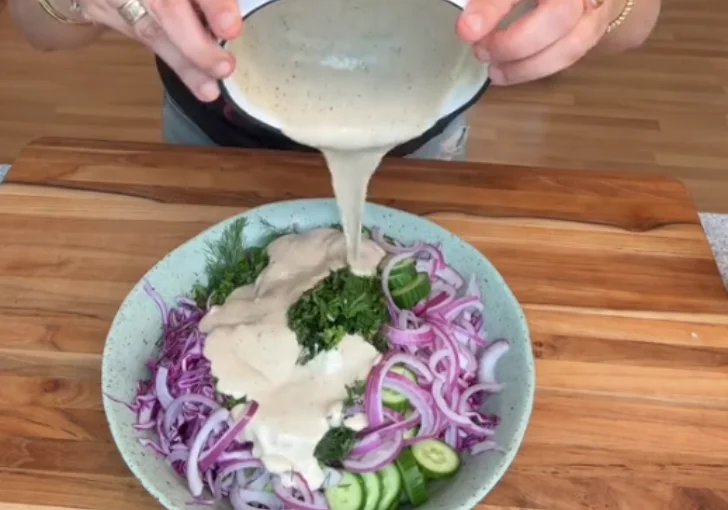 - Pour the tahini sumac dressing over the cabbage mixture. Toss the vegetables thoroughly so the dressing spreads evenly across all the ingredients.