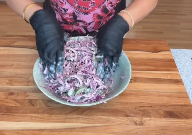 - Gently squeeze and mix the vegetables with your hands or tongs while tossing. This helps the cabbage absorb the dressing and ensures the flavors distribute throughout the salad.