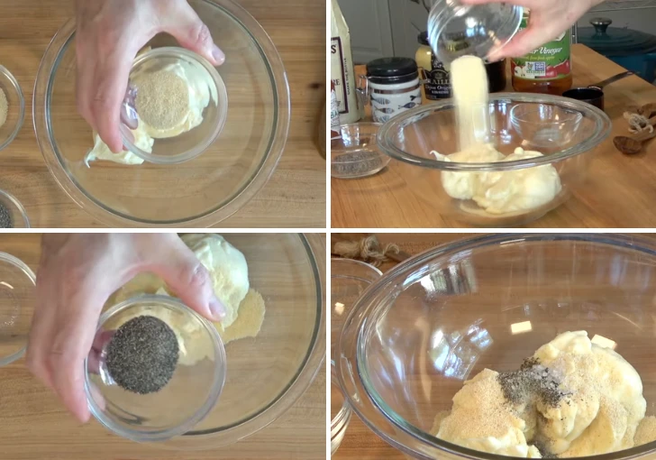 2. Sprinkle in the onion powder, garlic powder, black pepper, and salt. These seasonings balance the richness of the mayonnaise while setting up the savory profile associated with Newk’s-style white BBQ sauce.