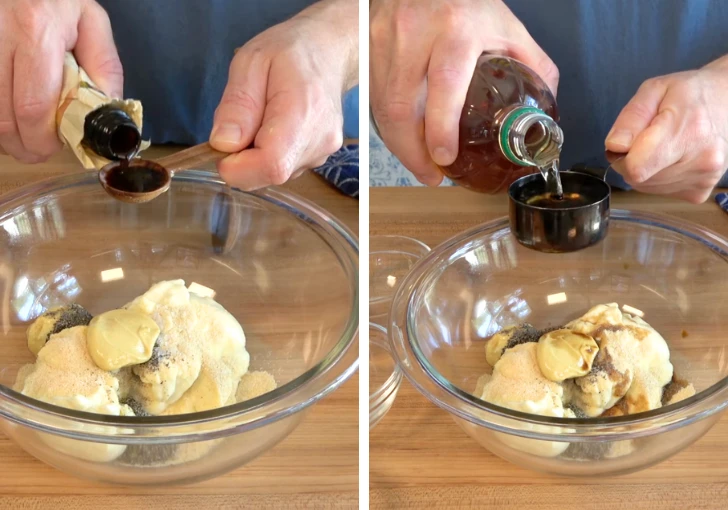 Pour in the Worcestershire sauce followed by the apple cider vinegar. The vinegar creates the signature Alabama-style sharpness, while the Worcestershire adds umami and complexity.